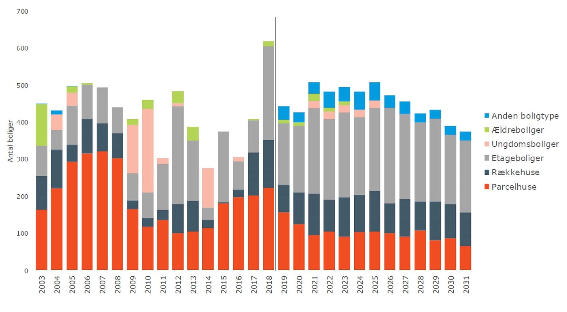 Prognosemæssigt forventes der frem til 2031 at være en mere jævn fordeling af boligtyper, med en større andel etageboliger og tæt-lav boliger.