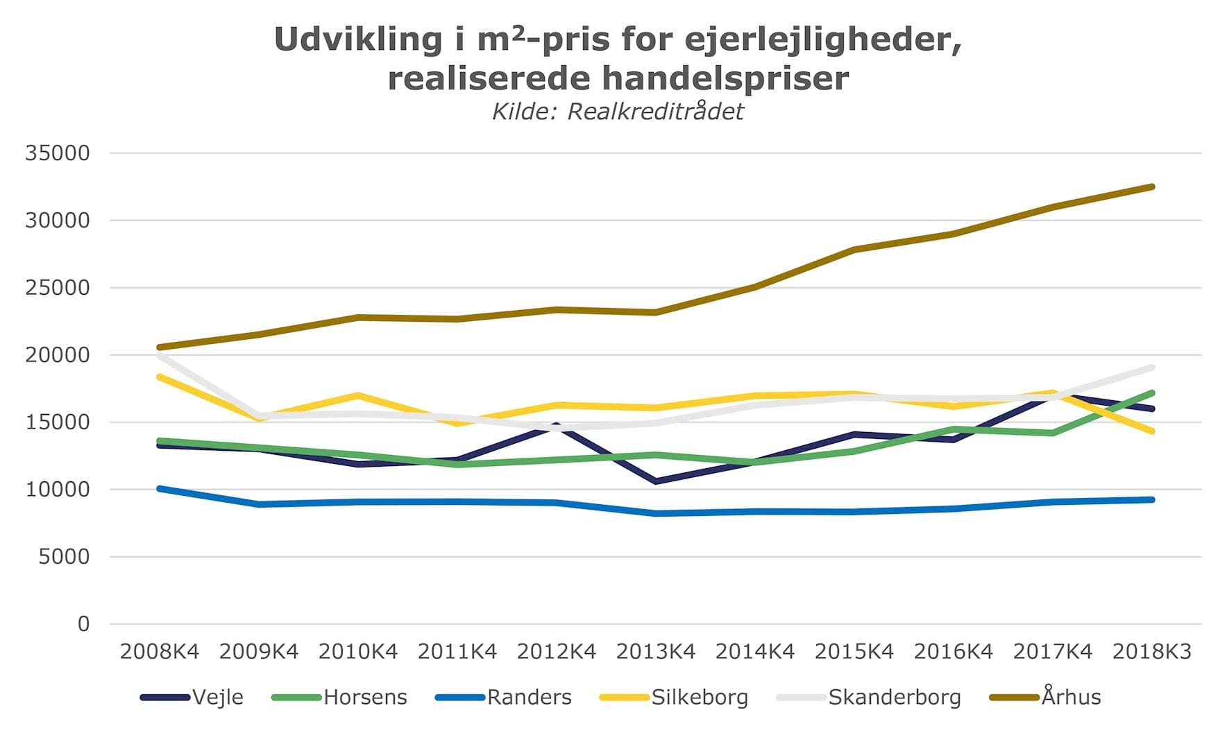 Udviklingen i de gennemsnitlige priser for ejerlejligheder ser anderledes ud. Her har prisudviklingen svinget meget i Horsens Kommune, mens priserne i Vejle og Aarhus er steget siden 2013.