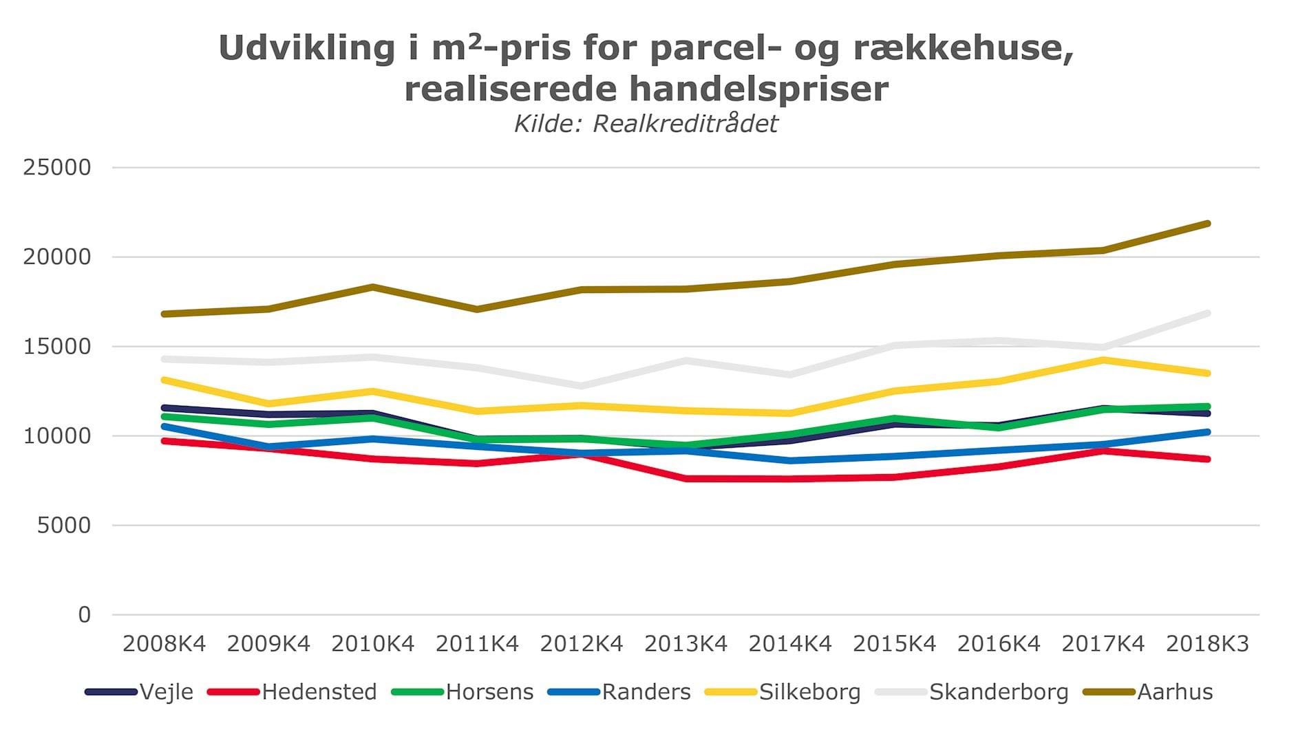 Priserne for parcel- og rækkehuse i Horsens Kommune er steget svagt siden 2013. Prisudviklingen ligger meget tæt på udviklingen i Vejle Kommune. Generelt er priserne for parcel- og rækkehuse steget i både Horsens Kommune og nabokommunerne. Priserne i Aarhus, Silkeborg og Skanderborg ligger dog væsentlig over Horsens.