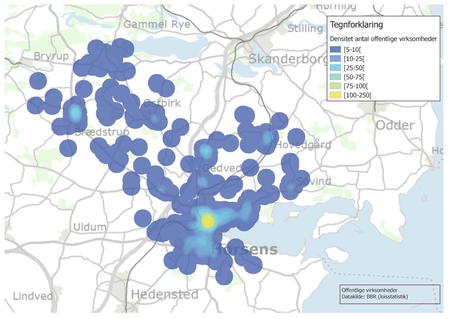 Offentlige virksomheder koncentrerer sig ikke overraskende omkring byerne i Horsens Kommune, med den største koncentration i og tæt på Horsens by.