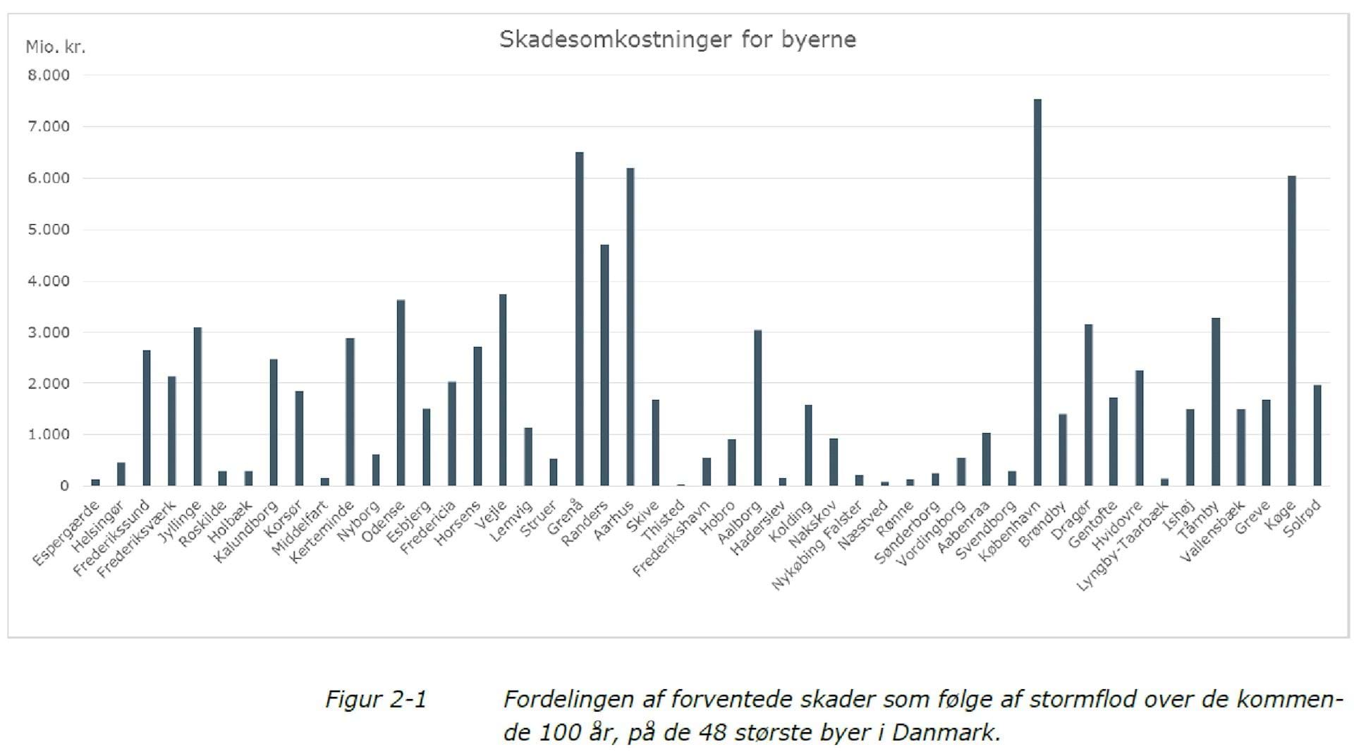 Tabellen herover kommer fra rapporten. Den viser nettonutidsværdien af de forventede samlede skadesomkostninger ved stormflod over de kommende 100 år for hver by og samlet set for alle 48 byer.