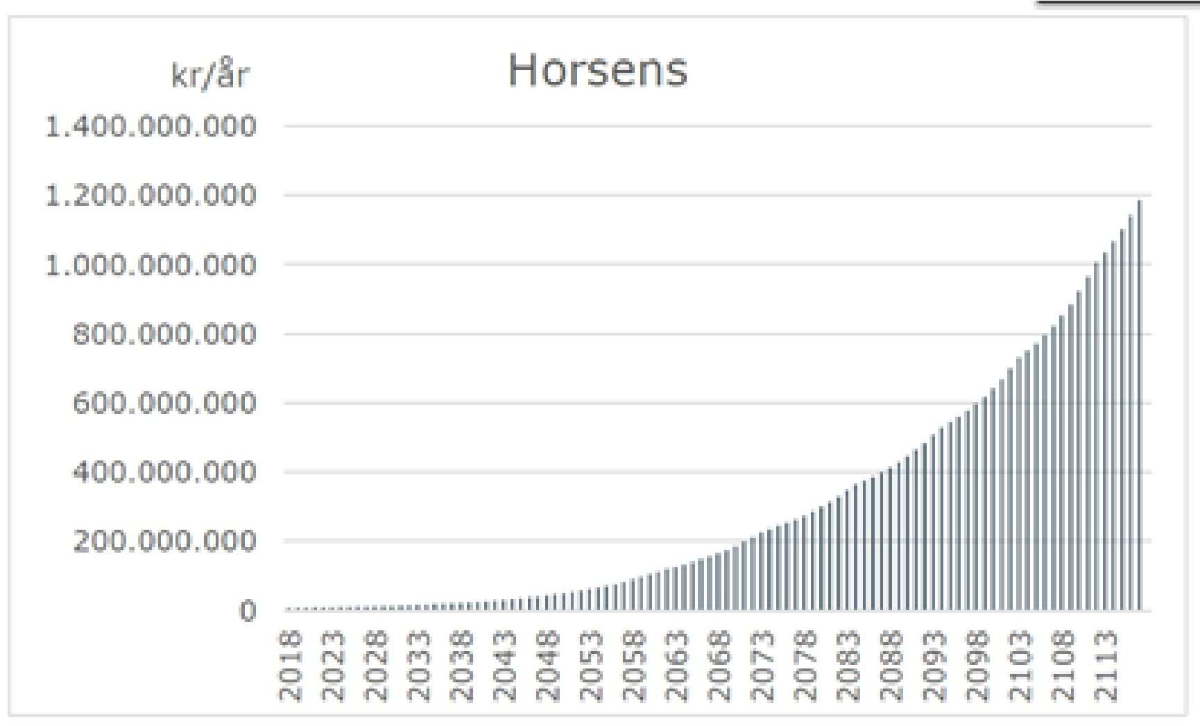 Tabellen herover, der ligeledes kommer fra rapporten, viser en forventning til udvikling i skader i den 100 årige periode for Horsens by. Udviklingen baseres som beskrevet herover på, at der ikke foretages afbødende foranstaltninger.