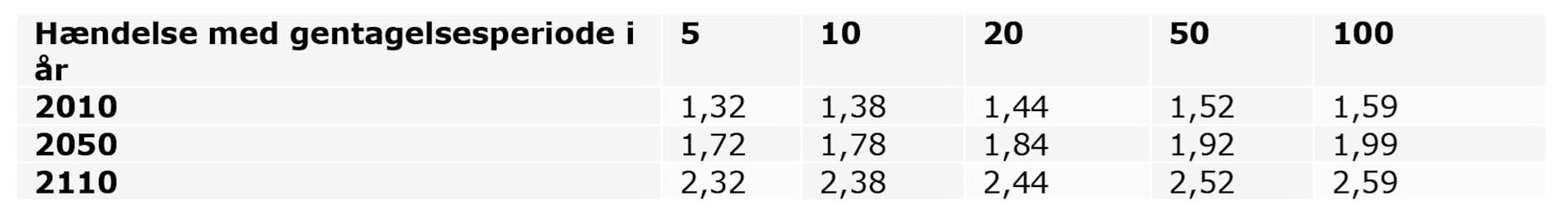 Kilder: FN’s internationale klimapanel IPCC, DMI, Cliwat, (et nordeuropæisk projekt med fokus på klimaforandringernes effekt på grundvand fra 2010.), GEUS rapport 2014/38, Henriksen, HJ, Pang, B, Olsen, M, Sonnenborg, TO, Refsgaard, JC og Madsen, H. 2014 Klimaeffekter på ekstremværdiafstrømninger.