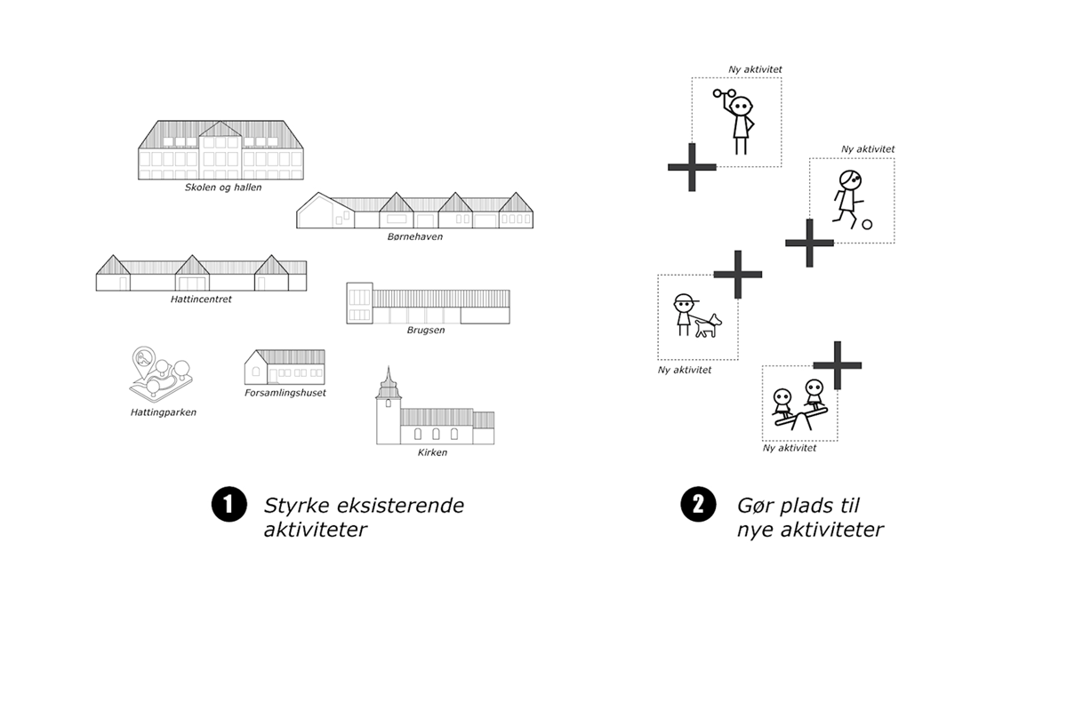 Sidst men ikke mindst er der behov for, at tilføre nye faciliteter, såvel som styrke eksisterende faciliteter. Flere og målrettede aktiviteter skal understøtte princippet om bedre sammenhæng, og gøre det attraktivt, at færdes i og omkring Hatting.