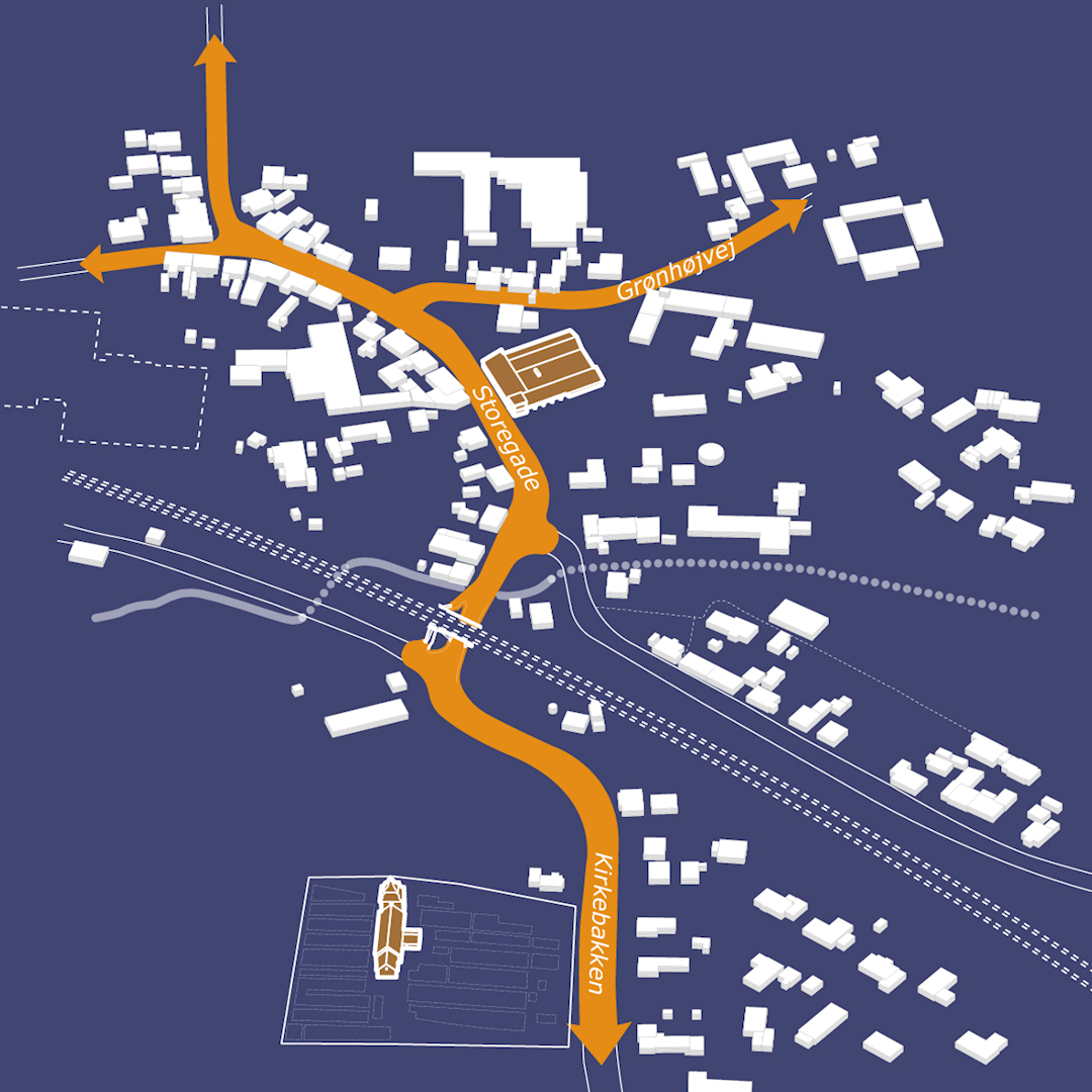 Ad byens ældste hovedstrøg (Kirkebakken, Storegade, Overholm og Grønhøjvej) skal hastigheden sænkes for bilisterne, og forholdene forbedres for de bløde trafikanter. Dette skal sammen med øget sammenhæng i byen understøtte grønne vaner, hvor det sunde valg (den aktive mobilitet - cykel og gang) er det lette og mest komfortable valg til mindre ærinder. I byens centrale gaderum kan der bl.a. indarbejdes klimatiltag, hvor regnvandsløsninger og begrønning bidrager positivt til byrummene.