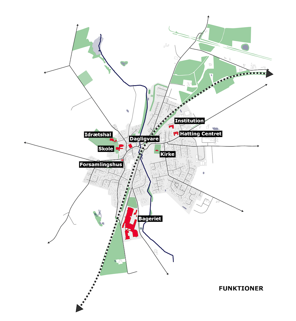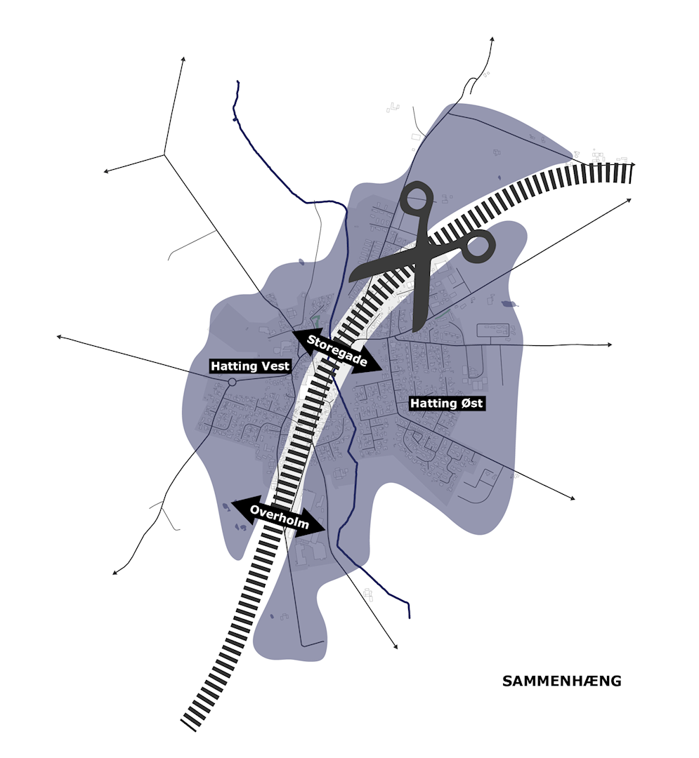 - Centrale byfunktioner spredt på begge sider af jernbanen