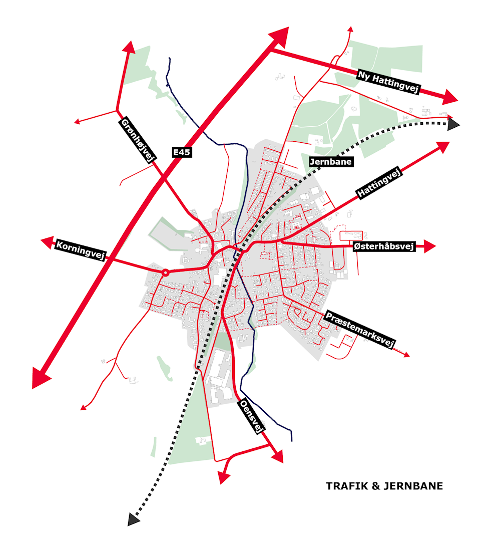 - Den middelalderlige vejstruktur og tilførelsen af jernbanen, der deler byen i to dele