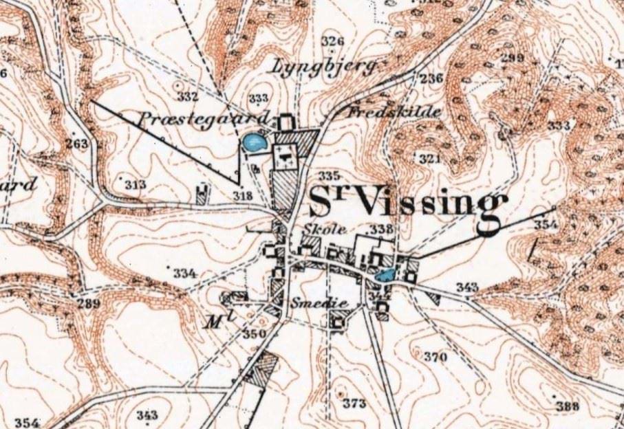 Herover: Gamle kort fra 1873 og 1909. Man kan se de gamle gårde, den oprindelige skole, smedien og den tidligere præstegård, som brændte ned. Vejstrukturen er genkendelig fra i dag. Højdeangivelser i fod.