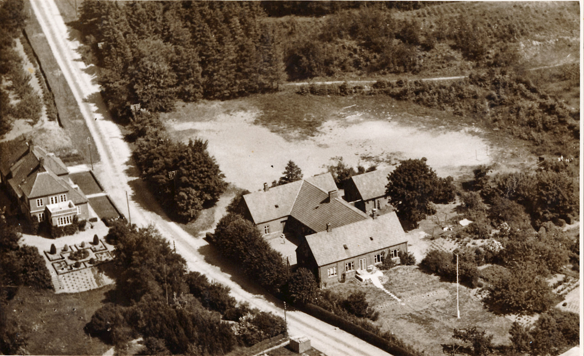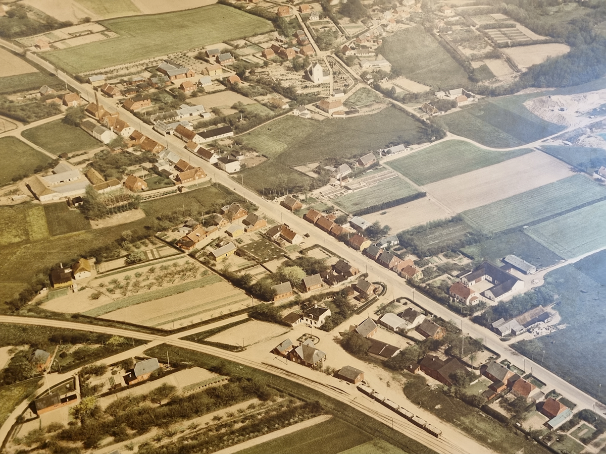 De to kort og luftfoto fra 1965 herover viser hvordan bækken, og engene omkring den, naturligt har opdelt byen gennem dens udvikling. De viser også hvordan byens centrum er fastholdt omkring vejkrydset, med skolen som et nyt tyngdepunkt efter 2. verdenskrig. I 1965 er det første villakvarter ved at blive anlagt.