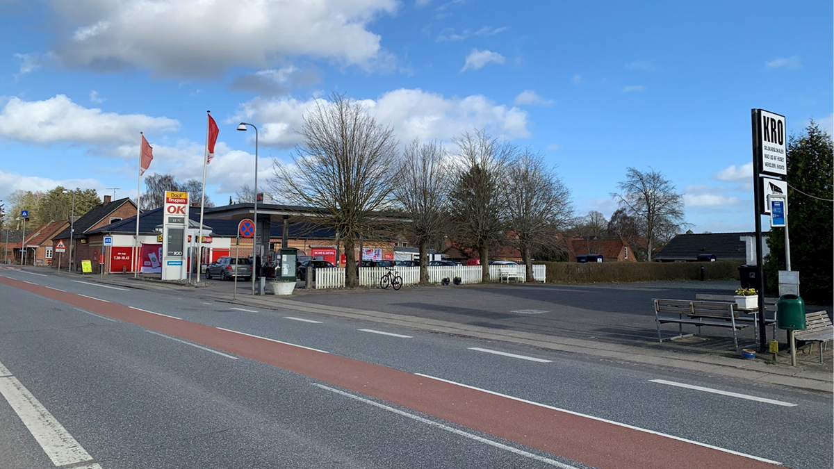 Tre steder langs Haldrupvej, hvor der foreslås indsatser omkring forskønnelse. 1. Brugsen set fra øst. 2. Brugsen og OK-tanken set fra vest. 3. Kroen