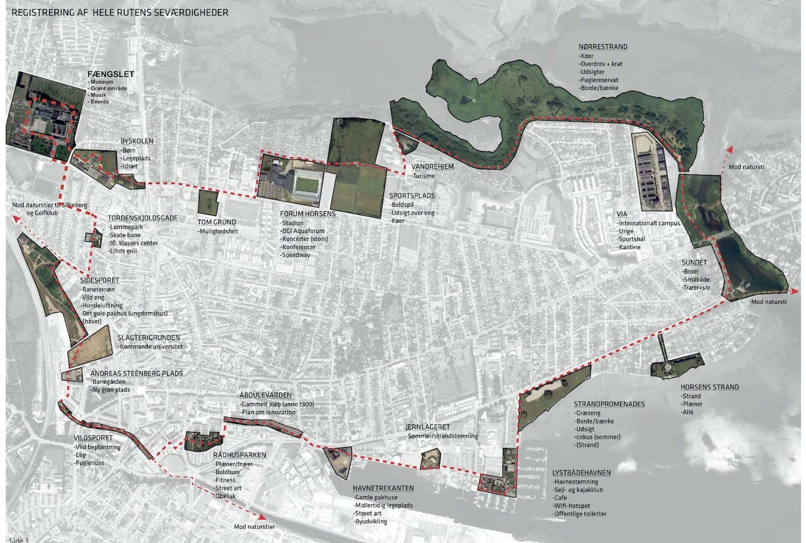 Stien skal løbe forbi og igennem Åboulevarden, Inderhavnen, Jernlageret, Lystbådehavnen, Langelinie, Sundet, VIA, Nørrestrand, Forum, DGI, Byskolen, FÆNGSLET, friarealet i Tordenskjoldsgade, Banearealerne og Campusgrunden.