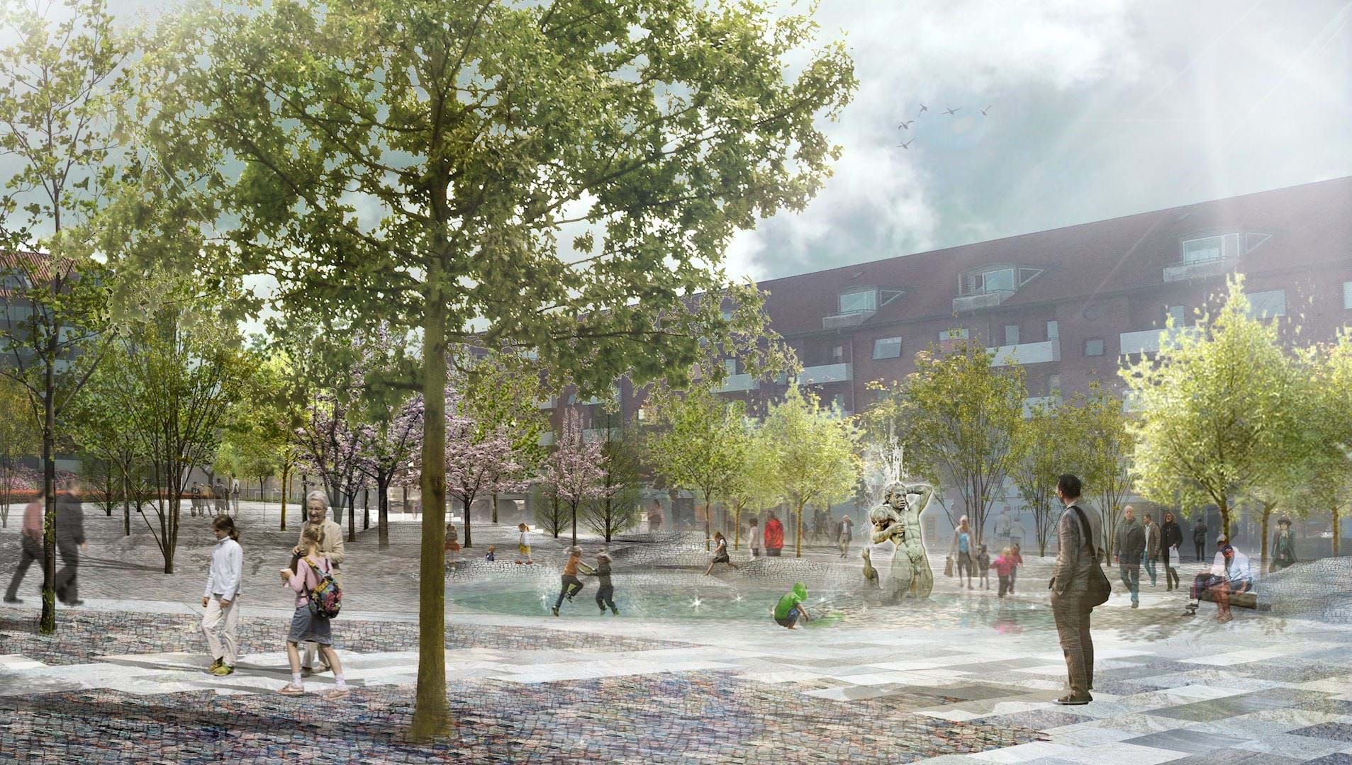 Området omkring Triton vil invitere til leg med vand og små bakker i belægningen.