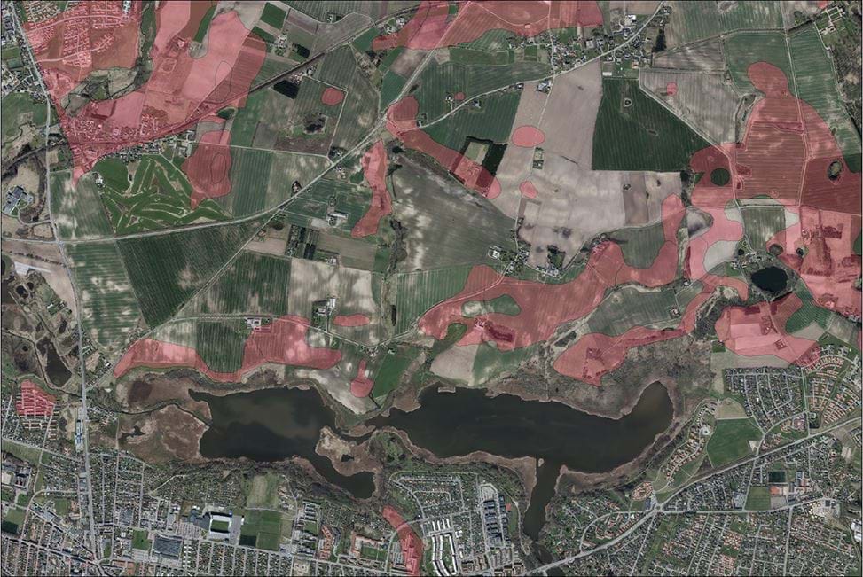 På kortet nedenunder er vist, hvor der forekommer sandede jorder, hvor der kan være egnede steder på de sydvendte skråninger.