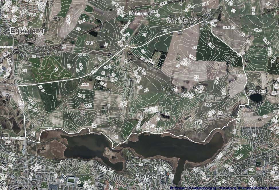 Natur og - Byudviklingsområdet er et storbakket morænelandskab, som mod syd går over i tunneldalen der rummer Nørrestrand. Terrænet falder fra omkring kote 50 syd for Serridslev til Nørrestrands kote 0, men der er store variationer i terrænformerne. Der er 3 højtliggende plateauer, jævnt sydskrånende flade, en nord-syd gående, smal og dyb dal med et vandløb (Fiskebæk), en øst-vest gående bred lavning nord for Nebel, en bugtet, stedvis smal lavning mellem Vær og Nebel og en markant dal mellem Vær og Nørrestrand. Sidstnævnte dal med Vær Sø er sløret af tilgroning, mens terrænforholdene i området generelt er tydelige.