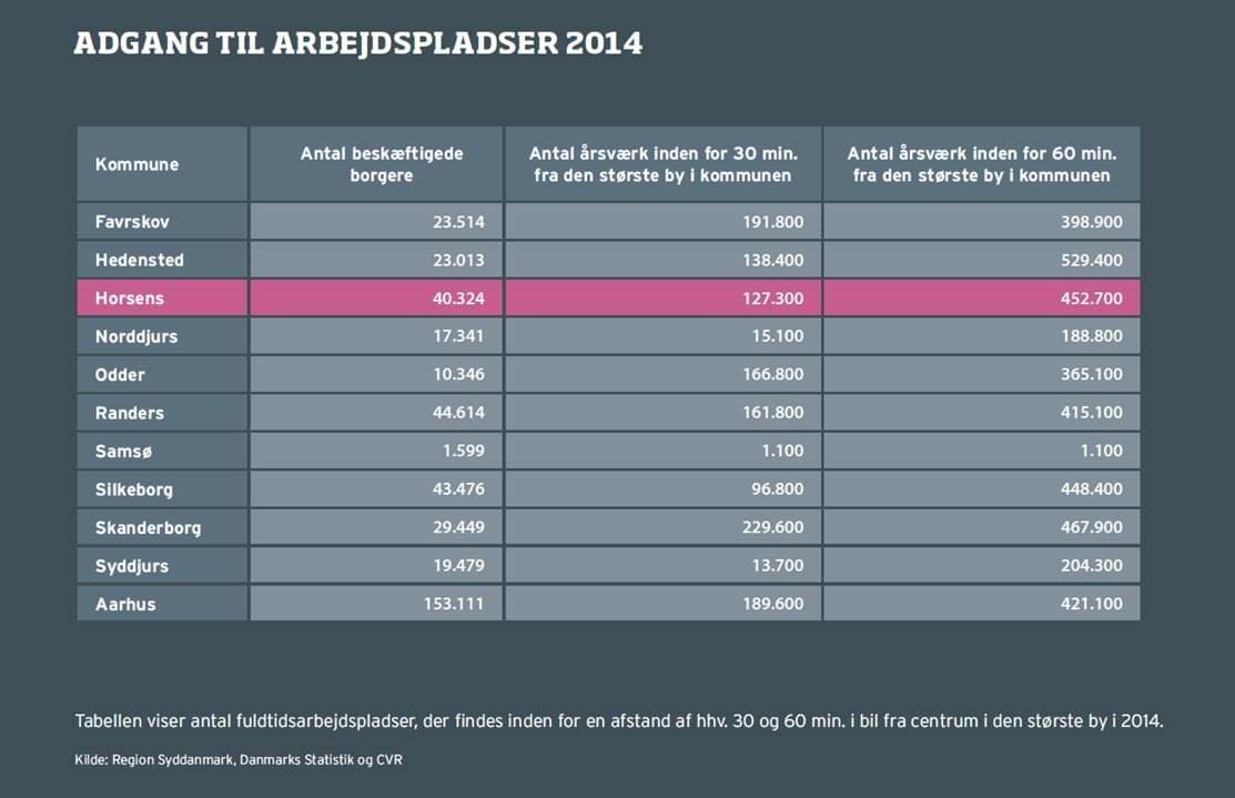 Tabellen viser antal fuldtidsarbejdspladser der findes inden for en afstand af hhv. 30 og 60 min. i bil fra centrum i den største by i 2014.