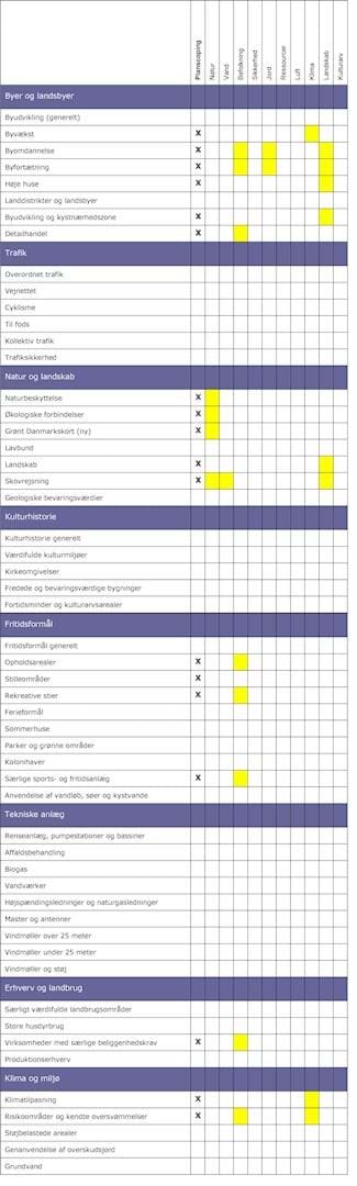 Overbliksskema med resultatet af scoping af kommuneplanens retningslinjer.