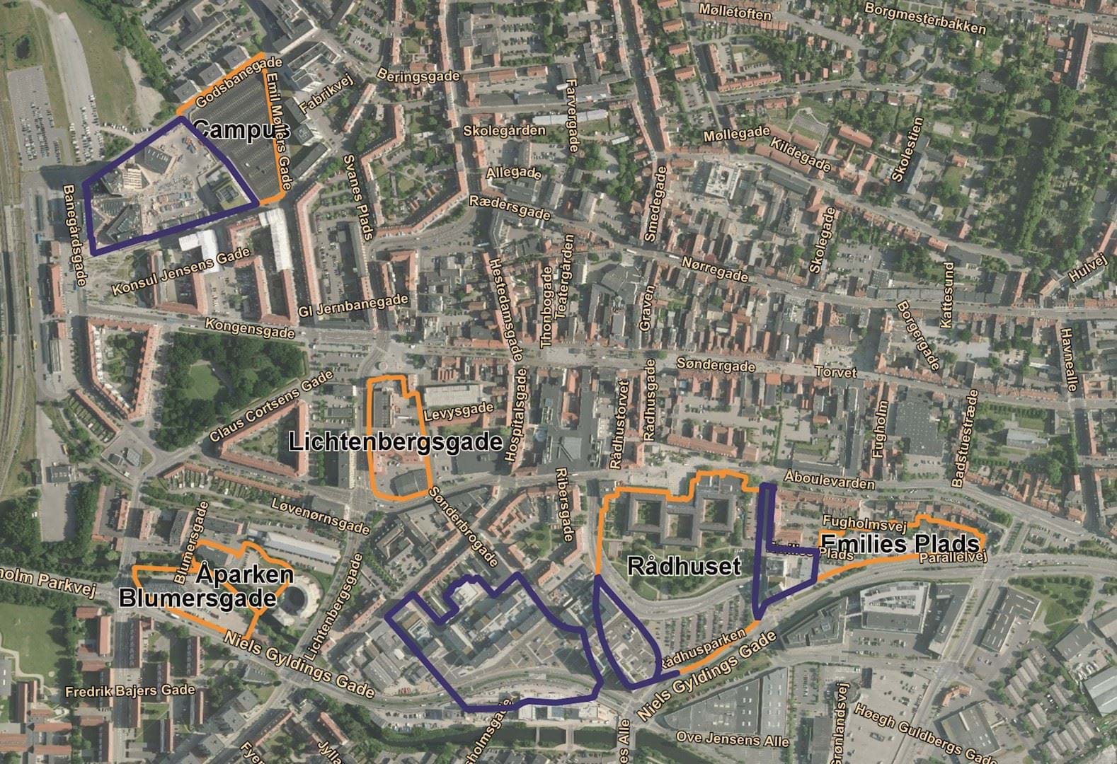Den vestlige del af Emilies Plads, hvor der er bygget nyt, er taget ud.