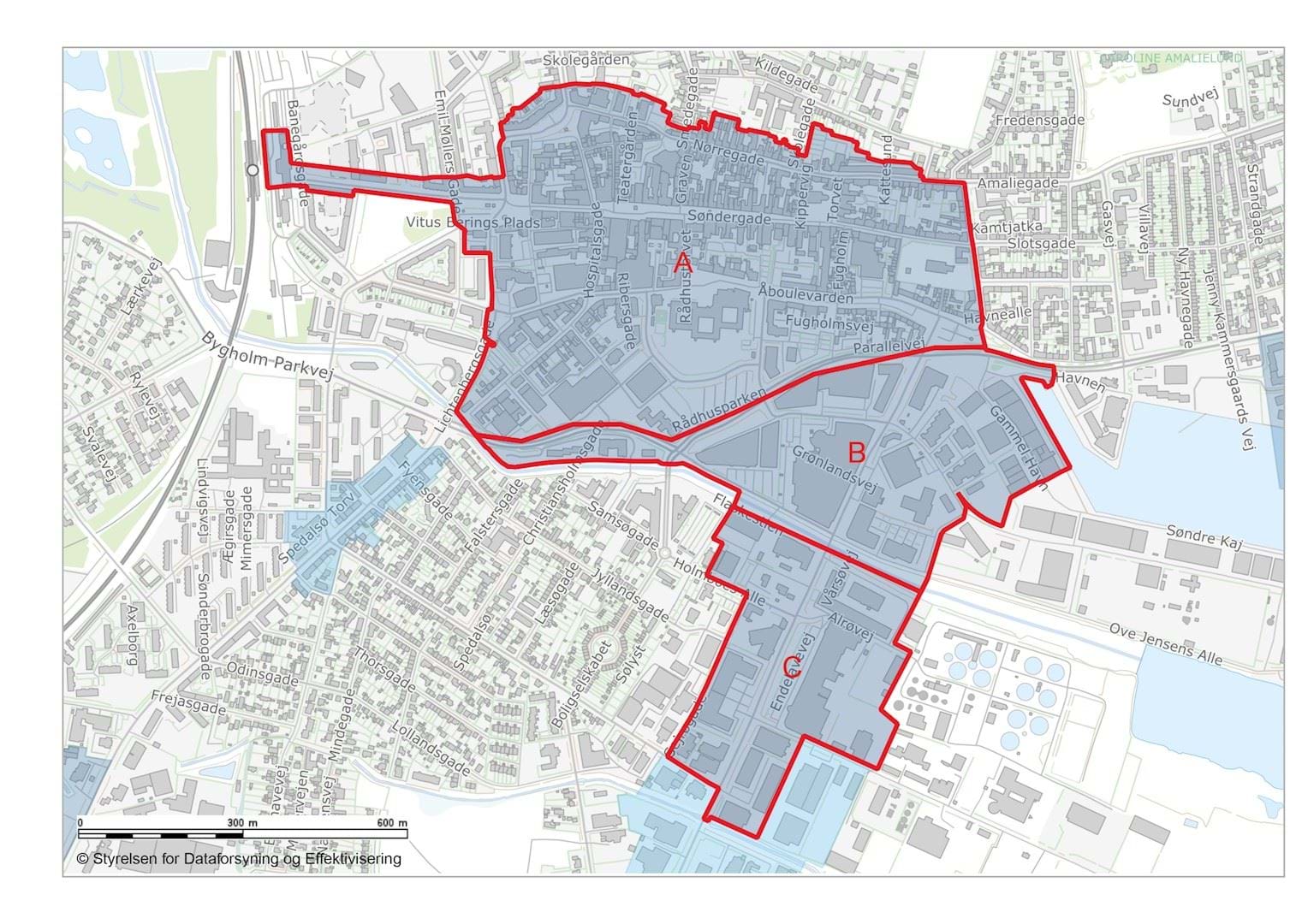 Konkret kan der i zone A, der omfatter arealet nord for Niels Gyldings Gade, etableres dagligvarebutikker med et bruttoetageareal på højst 5.000 m2 og udvalgsvarebutikker med et bruttoetageareal på højst 12.000 m2. Denne zone betragtes som det historiske bycenter.
