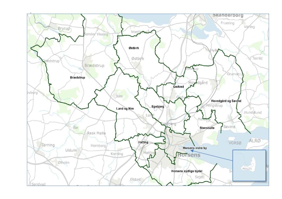 - Bymidterne Horsens, Brædstrup, Egebjerg, Lund, Østbirk, Gedved, Hatting og Hovedgård.