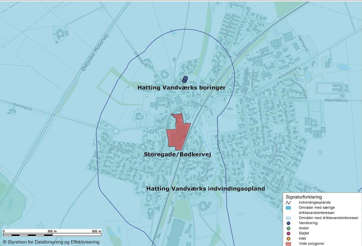 Arealudlægget ligger umiddelbart udenfor de afgrænsede boringsnære beskyttelsesområder (BNBO) omkring Hatting Vandværks boringer.