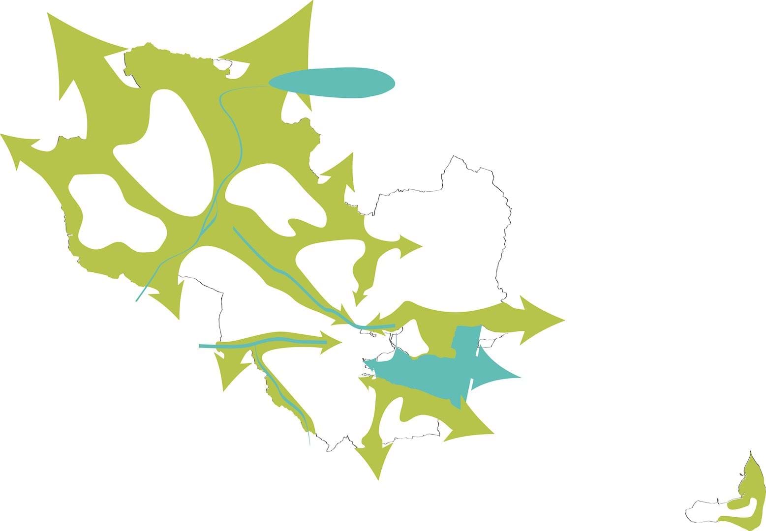 - Klimatilpasning, der fokuserer på at sikre bebyggelse og infrastruktur mod oversvømmelse og samtidigt skabe nye rekreative tilbud og nye naturområder.