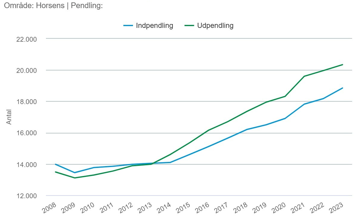 Udvikling i ind- og udpendling i Horsens Kommune fra 2008 til 2023. Kilde: Danmarks statistik, PEND101