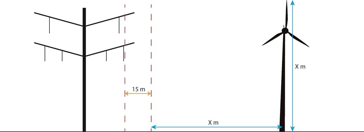 Billedet viser princippet for, hvordan vindmøller placeres, så de overholder sikkerhedshensynene i forhold til højspændingsledninger.