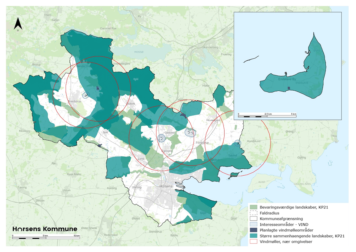 Billedet viser et kort over kommunen. På kortet er medtaget kommuneplanens udpegninger af bevaringsværdige og større sammenhængende landskaber, eksisterende vindmøllerammer og interesseområderne. For interesseområderne er der angivet områdernes næromgivelser på 5 km.
