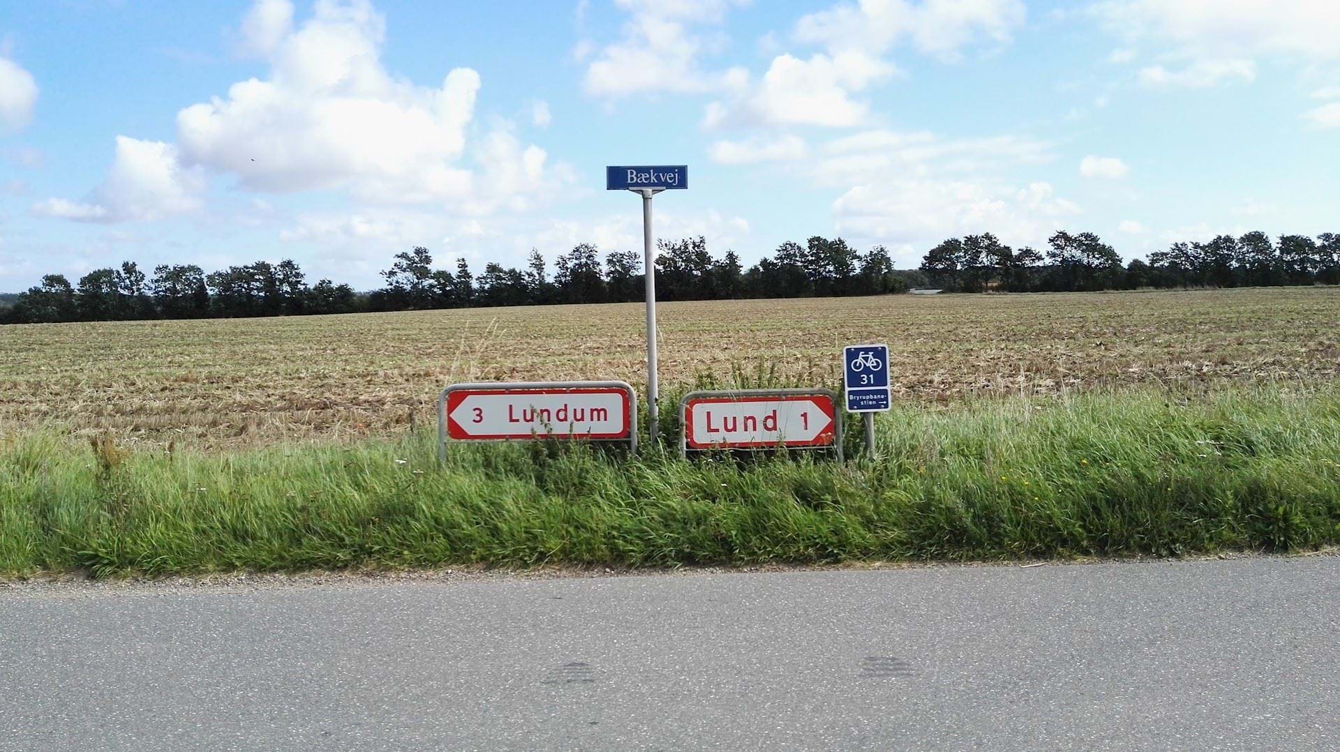 Afstande til hhv. Lundum, Lund og Bryrupbanestien ses på skiltene. I baggrunden: Nabomark til lokalplanområdet på modsatte side af Bækvej.