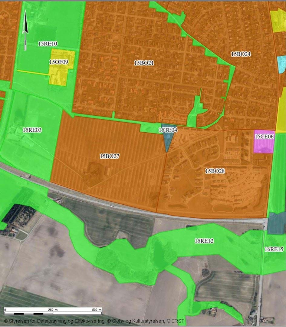 Lokalplanområdet er omfattet af rammeområde 15BO27 der fastlægger områdets anvendelse til boligformål. Indenfor rammen kan etableres åben-lav boliger, men der er også mulighed for enkelte bebyggelser med tæt-lav boliger, hvis det enkelte område kan indrettes hensigtsmæssigt. Indenfor området kan der også etableres nærrekreative arealer og kollektive anlæg til områdets forsyning.