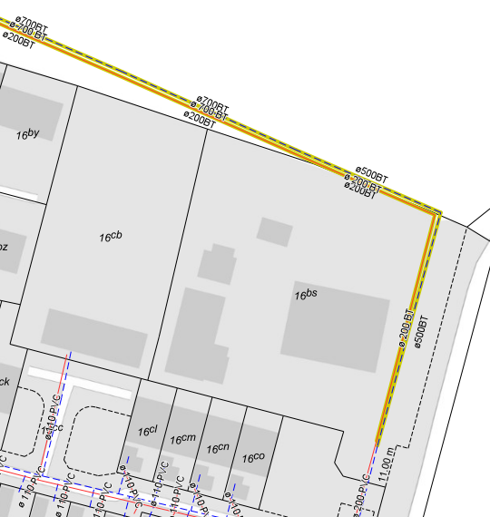 Af de fem servitutter på mat.nr. 16-bs, har Servitut om Vandledning pr. 31.10.2016, indflydelse på disponering af kommende bebyggelse inden for lokalplanområdet. Servitutten omhandler tinglysning til sikring af allerede etablerede vandledning (regn- og spildevand) over ejendommen, som vist på nedenstående kort.