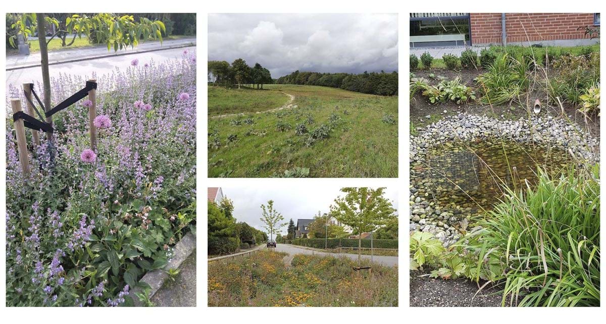 Inspirationsbilleder til regnvandshåndtering på terræn i både stor og lille skala. Det er vigtigt, at det får en landskabelig og kontekstbevidst bearbejdning, så det bliver en del af området det skal være en del af.