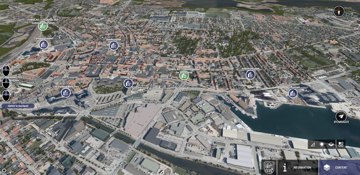 Vores 3D-bymodel er tilgængelig online via OpenCities Planner, hvor modellen kan ses i en browser. Bemærk at visning af 3D-modellen er afhængig af din computer og internethastighed, der kan derfor forekomme varieret ventetid på visningen.