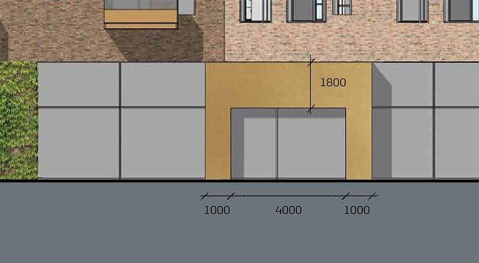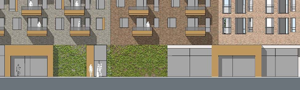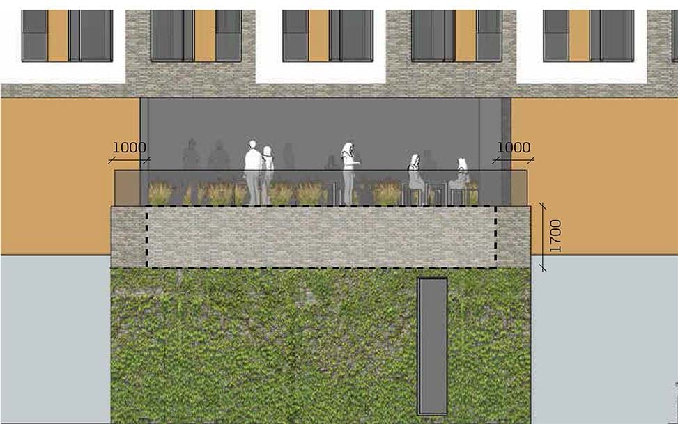 Principudsnit af facade mod taghave i delområde 1. Facaderne kan suppleres af træpartier eller lignende materiale for at skabe et imødekommende opholdsmiljø med varierende teksturer.
