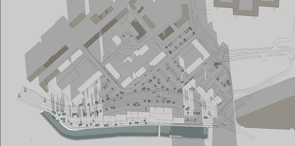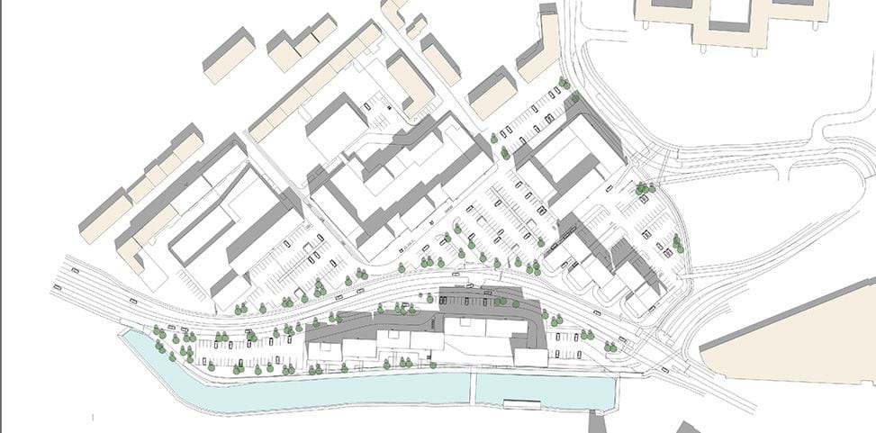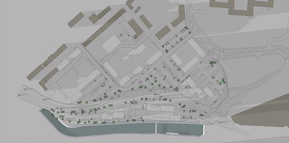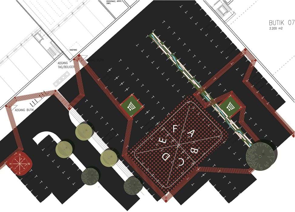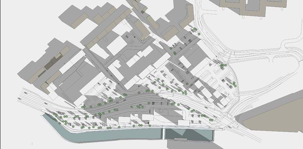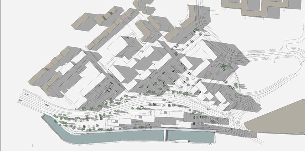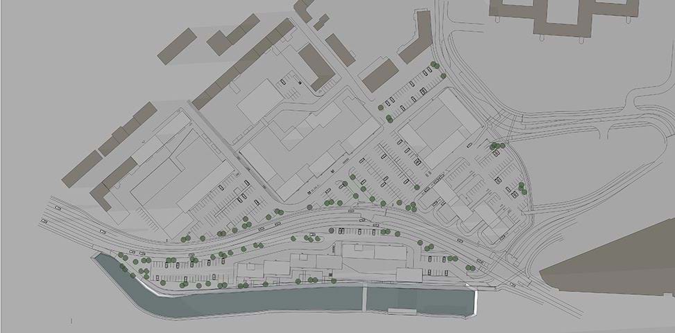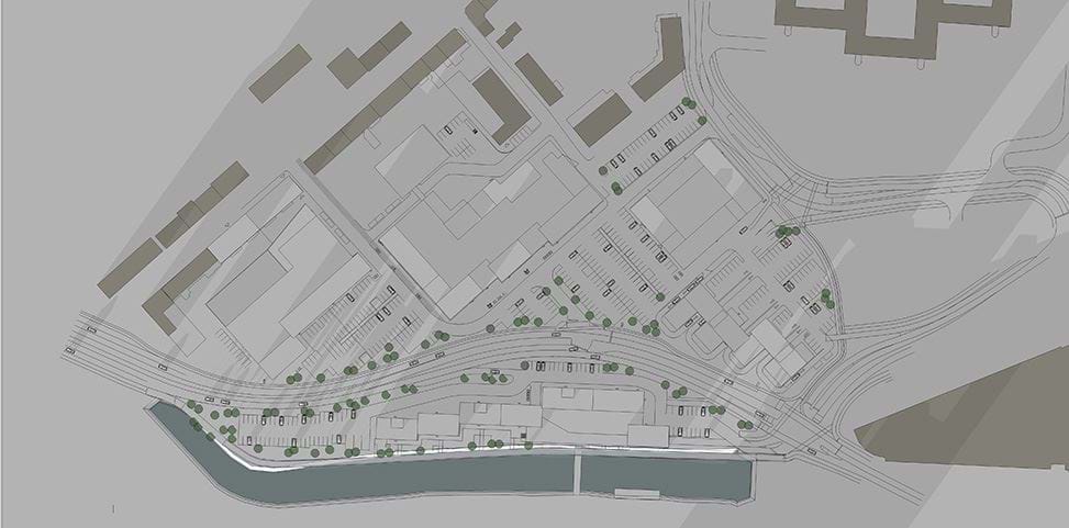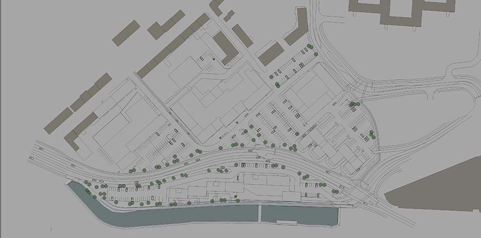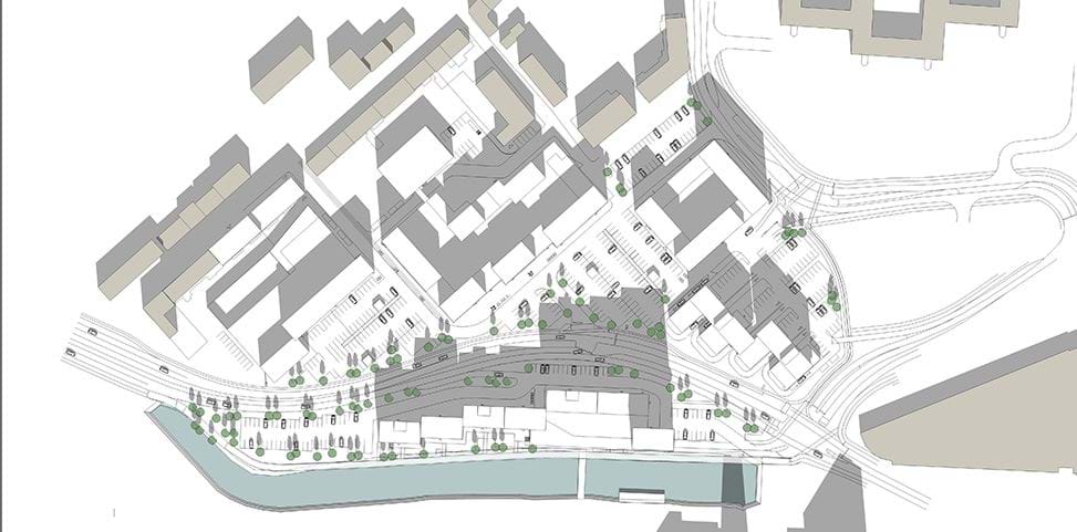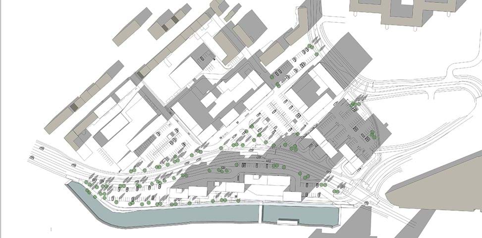 Principudsnit "Parkering i byrum". Byrummet bearbejdes med belægningsskift, mønstre, belysning og beplantning.