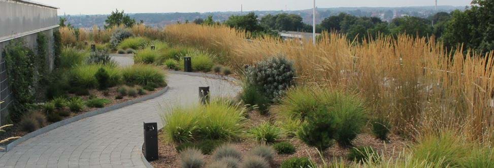Reference på hvordan en taghaver med "vild og robust" beplantning, stisystem og parkbelysning kan udformes (SLA).