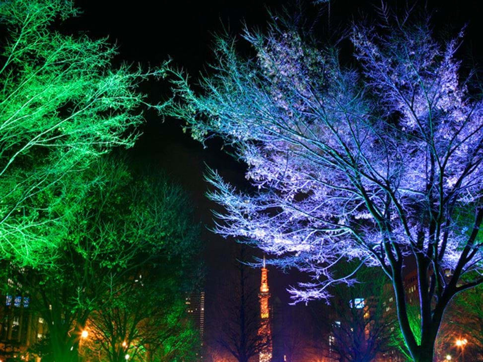 Effektbelysning på en trærække. Belysningen skaber en særlig stemning.