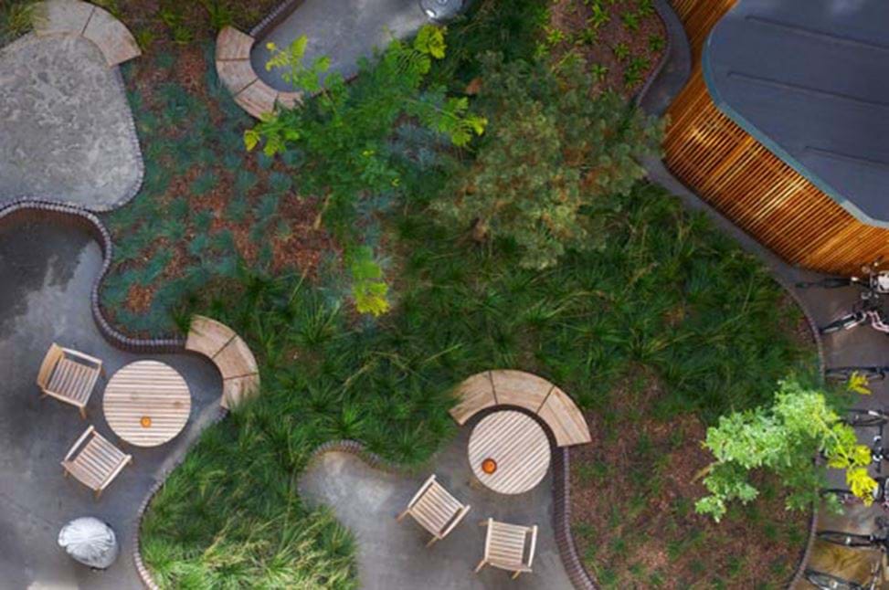 Grafiske mønstre, inventar og beplantning i en samlet helhed.