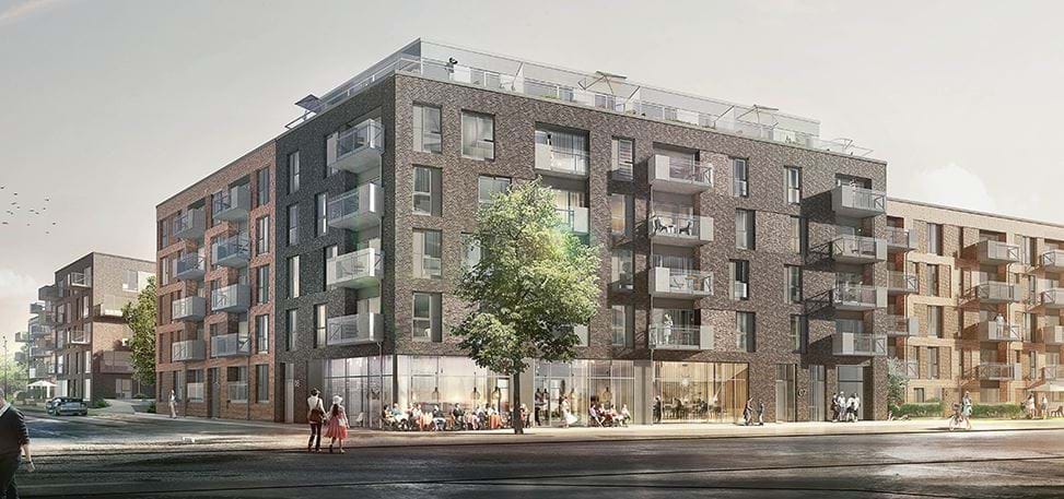 Inspirationsbillede af facader med materiale- og farvevalg, detaljering mv., som fremtræder med et sammenhængende arkitektonisk formsprog (Arkitema).