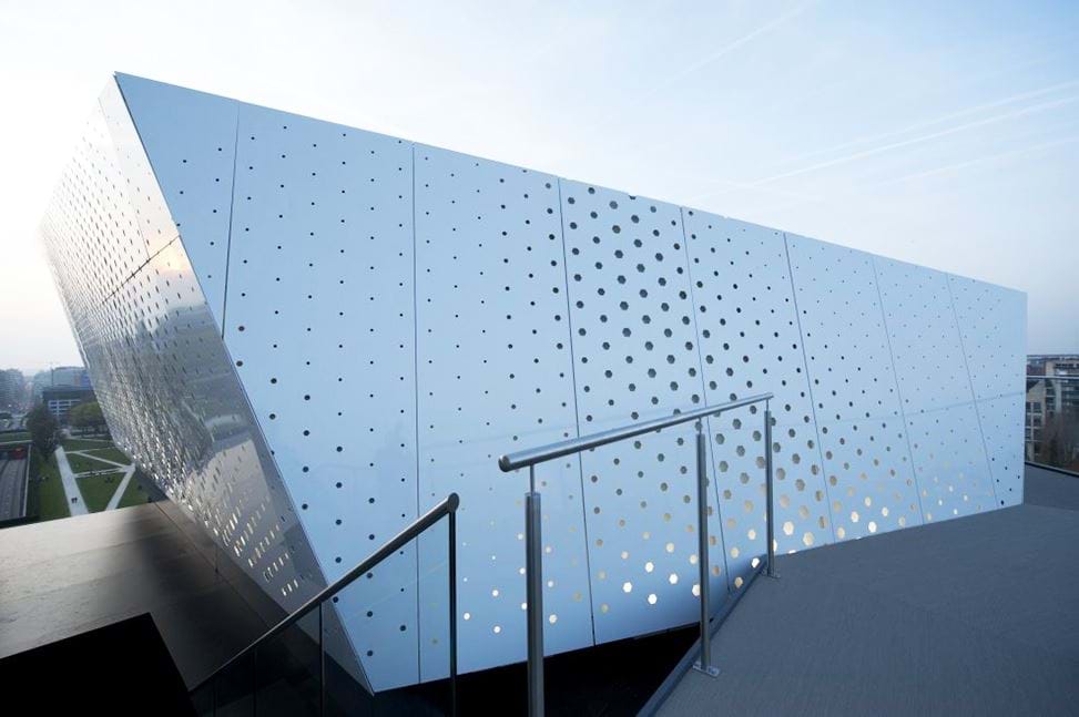 Facaden er udformet med et relief/mønster af teglsten, som danner en spændende struktur. Facadens struktur "flettes" sammen med begrønning. Bearbejdningen af facaden sikrer, at facaden ikke opleves, som en trist bagsiden i byen.