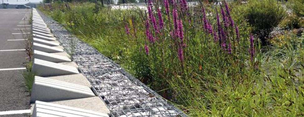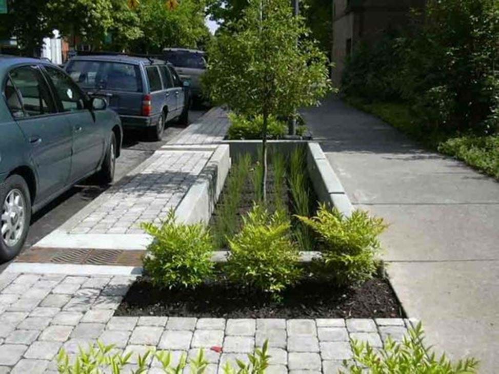 Regnvandsbede i et gaderum. Beplantningen bidrager til et grønt udtryk i gaden samt nedskalere gaderummet i mindre rumligheder.