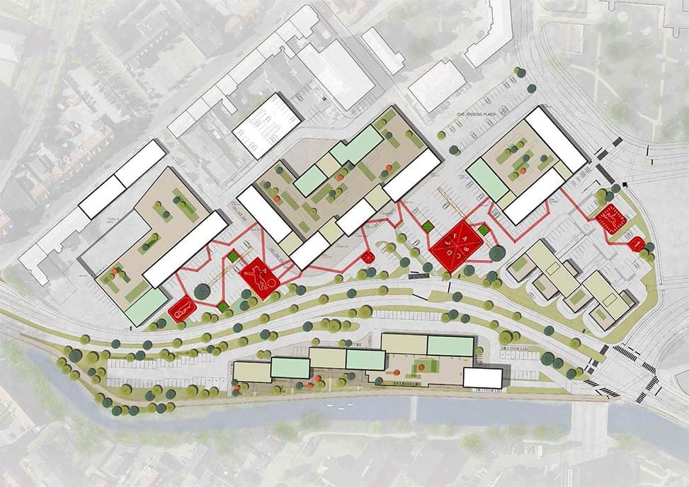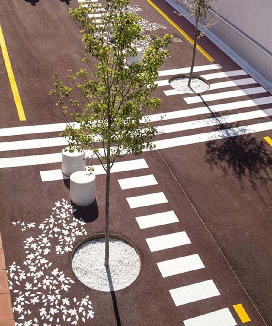 På billedet er der anvendt termoplast, som tegner mønster på belægning og der skabes nye spændende og rå byrum.