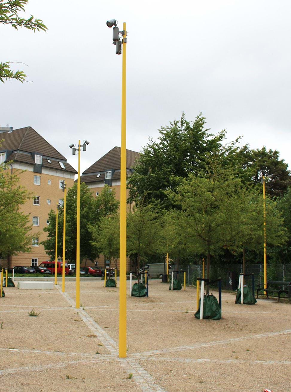 Lysmaster som skaber karakter til et byrum i form af deres farve (gul signalfarve).