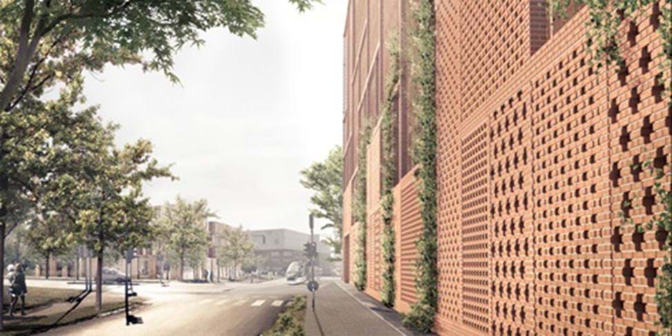 Facadebillede på et eksempel hvorledes facader på parkering i konstruktion kan udformes. Facaderne fremstår med en "lethed", som i høj grad begrønnes.