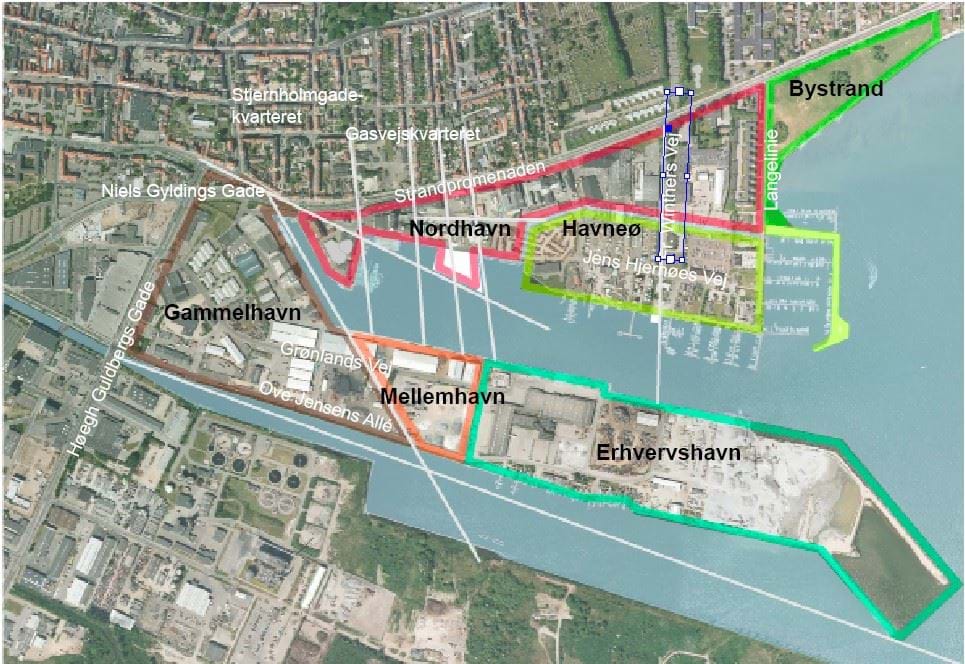 Lokalplanen omfatter Masterplanens delområder Nordhavnen og Havneøen, hvor omdannelsen forventes at komme i gang først. Endvidere Bystranden/Langelinie indgår fordi den visuelt og funktionsmæssigt har sammenhæng med lystbådehavnens område. Havnetrekanten er udeladt, fordi den allerede er lokalplanlagt og byggeriet er igang.